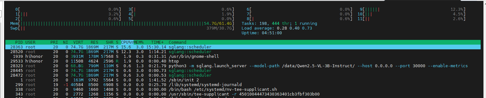 # Jetson Orin 测试 ## 2.1 直接测试 可以直接使用jetson container来部署sglang;也可以安装pytorch等jetson版本后直接运行sglang,可以直接使用第一种方案比较方便。 https://github.com/dusty-nv/jetson-containers https://hub.docker.com/r/dustynv/sglang https://hub.docker.com/r/dustynv/l4t-pytorch ### 2.1.1 镜像拉取并创建容器 ``` docker pull dustynv/sglang:r36.4-cu128-24.04 ``` 完成sglang的镜像拉取,然后启动容器,注意可以直接根据上方链接使用sglang的容器 ``` docker run --runtime nvidia -it --rm -v /data/:/data/ --network=host dustynv/sglang:r36.4-cu128-24.04 ``` ### 2.1.2 查看sglang 可以直接查看sglang版本 ``` root@tegra-ubuntu:/# pip list |grep sglang sglang 0.4.7.post1 /opt/venv/lib/python3.12/site-packages pip ``` ### 2.1.3 提前准备好模型启动 使用Qwen2.5-VL-3B模型测试 ``` python3 -m sglang.launch_server --model-path ./Qwen2.5-VL-3B-Instruct/ --host 0.0.0.0 --port 30000 --enable-metrics ``` ### 2.1.4 相关性能指标参考如下 执行mmlu的opencompass评测(纯文本调用评测先) - 功耗 27W左右(按照25W设置的功耗,因为是orin nx的设置,所以这里暂时没有修改,非agx orin的峰值功耗) - 显存(内存)占用30GB左右 fp32部署  ``` 10-23-2025 11:13:25 RAM 56177/62842MB (lfb 1x4MB) SWAP 379/31421MB (cached 0MB) CPU [0%@729,4%@729,2%@729,5%@729,0%@729,0%@729,0%@729,0%@729,0%@729,0%@729,0%@729,0%@729] GR3D_FREQ 99% cpu@55.843C tboard@44.875C soc2@51.718C tdiode@46C soc0@52.656C gpu@53.531C tj@55.843C soc1@52.718C VDDQ_VDD2_1V8AO 3918mW/3793mW VDD_GPU_SOC 11894mW/11871mW VDD_CPU_CV 0mW/46mW VIN_SYS_5V0 9676mW/9480mW ``` - 每秒token输出如下 ``` [2025-10-23 11:14:57] Decode batch. #running-req: 8, #token: 1544, token usage: 0.00, cuda graph: True, gen throughput (token/s): 86.95, #queue-req: 0 [2025-10-23 11:15:00] Decode batch. #running-req: 8, #token: 1864, token usage: 0.00, cuda graph: True, gen throughput (token/s): 96.25, #queue-req: 0 [2025-10-23 11:15:04] Decode batch. #running-req: 8, #token: 2184, token usage: 0.00, cuda graph: True, gen throughput (token/s): 96.18, #queue-req: 0 [2025-10-23 11:15:05] INFO: 192.168.1.200:37808 - "POST /v1/chat/completions HTTP/1.1" 200 OK [2025-10-23 11:15:07] Decode batch. #running-req: 7, #token: 2206, token usage: 0.00, cuda graph: True, gen throughput (token/s): 88.06, #queue-req: 0 [2025-10-23 11:15:09] INFO: 192.168.1.200:43068 - "POST /v1/chat/completions HTTP/1.1" 200 OK [2025-10-23 11:15:09] INFO: 192.168.1.200:40004 - "POST /v1/chat/completions HTTP/1.1" 200 OK [2025-10-23 11:15:10] Decode batch. #running-req: 5, #token: 1740, token usage: 0.00, cuda graph: True, gen throughput (token/s): 75.90, #queue-req: 0 ``` ### 2.1.5 实际opencompass mmlu的评测指标 可以对比一下跟4090上的差异 - Qwen2.5-VL-3B-Instruct-Jetson-SGLang-API ``` The markdown format results is as below: | dataset | version | metric | mode | Qwen2.5-VL-3B-Instruct-Jetson-SGLang-API | |----- | ----- | ----- | ----- | -----| | lukaemon_mmlu_college_biology | bf6b83 | accuracy | gen | 68.06 | | lukaemon_mmlu_college_chemistry | bf6b83 | accuracy | gen | 41.00 | | lukaemon_mmlu_college_computer_science | bf6b83 | accuracy | gen | 52.00 | | lukaemon_mmlu_college_mathematics | bf6b83 | accuracy | gen | 46.00 | | lukaemon_mmlu_college_physics | bf6b83 | accuracy | gen | 56.86 | | lukaemon_mmlu_electrical_engineering | bf6b83 | accuracy | gen | 58.62 | | lukaemon_mmlu_astronomy | bf6b83 | accuracy | gen | 67.11 | | lukaemon_mmlu_anatomy | bf6b83 | accuracy | gen | 57.78 | | lukaemon_mmlu_abstract_algebra | bf6b83 | accuracy | gen | 42.00 | | lukaemon_mmlu_machine_learning | bf6b83 | accuracy | gen | 50.89 | | lukaemon_mmlu_clinical_knowledge | bf6b83 | accuracy | gen | 67.55 | | lukaemon_mmlu_global_facts | bf6b83 | accuracy | gen | 43.00 | | lukaemon_mmlu_management | bf6b83 | accuracy | gen | 70.87 | | lukaemon_mmlu_nutrition | bf6b83 | accuracy | gen | 64.38 | | lukaemon_mmlu_marketing | bf6b83 | accuracy | gen | 79.06 | | lukaemon_mmlu_professional_accounting | bf6b83 | accuracy | gen | 49.65 | | lukaemon_mmlu_high_school_geography | bf6b83 | accuracy | gen | 74.75 | | lukaemon_mmlu_international_law | bf6b83 | accuracy | gen | 72.73 | | lukaemon_mmlu_moral_scenarios | bf6b83 | accuracy | gen | 47.26 | | lukaemon_mmlu_computer_security | bf6b83 | accuracy | gen | 76.00 | | lukaemon_mmlu_high_school_microeconomics | bf6b83 | accuracy | gen | 74.37 | | lukaemon_mmlu_professional_law | bf6b83 | accuracy | gen | 41.00 | | lukaemon_mmlu_medical_genetics | bf6b83 | accuracy | gen | 69.00 | | lukaemon_mmlu_professional_psychology | bf6b83 | accuracy | gen | 58.82 | | lukaemon_mmlu_jurisprudence | bf6b83 | accuracy | gen | 71.30 | | lukaemon_mmlu_world_religions | bf6b83 | accuracy | gen | 78.36 | | lukaemon_mmlu_philosophy | bf6b83 | accuracy | gen | 64.31 | | lukaemon_mmlu_virology | bf6b83 | accuracy | gen | 47.59 | | lukaemon_mmlu_high_school_chemistry | bf6b83 | accuracy | gen | 58.62 | | lukaemon_mmlu_public_relations | bf6b83 | accuracy | gen | 60.00 | | lukaemon_mmlu_high_school_macroeconomics | bf6b83 | accuracy | gen | 66.92 | | lukaemon_mmlu_human_sexuality | bf6b83 | accuracy | gen | 67.94 | | lukaemon_mmlu_elementary_mathematics | bf6b83 | accuracy | gen | 84.13 | | lukaemon_mmlu_high_school_physics | bf6b83 | accuracy | gen | 56.95 | | lukaemon_mmlu_high_school_computer_science | bf6b83 | accuracy | gen | 75.00 | | lukaemon_mmlu_high_school_european_history | bf6b83 | accuracy | gen | 73.94 | | lukaemon_mmlu_business_ethics | bf6b83 | accuracy | gen | 64.00 | | lukaemon_mmlu_moral_disputes | bf6b83 | accuracy | gen | 61.85 | | lukaemon_mmlu_high_school_statistics | bf6b83 | accuracy | gen | 62.50 | | lukaemon_mmlu_miscellaneous | bf6b83 | accuracy | gen | 76.12 | | lukaemon_mmlu_formal_logic | bf6b83 | accuracy | gen | 47.62 | | lukaemon_mmlu_high_school_government_and_politics | bf6b83 | accuracy | gen | 77.72 | | lukaemon_mmlu_pre