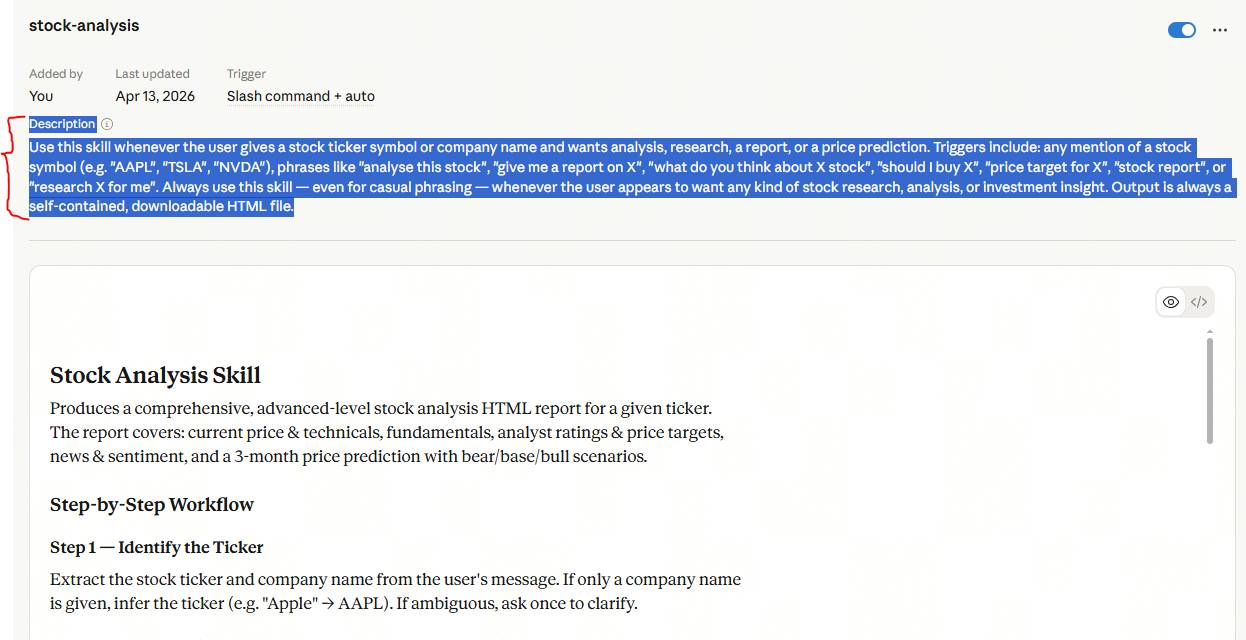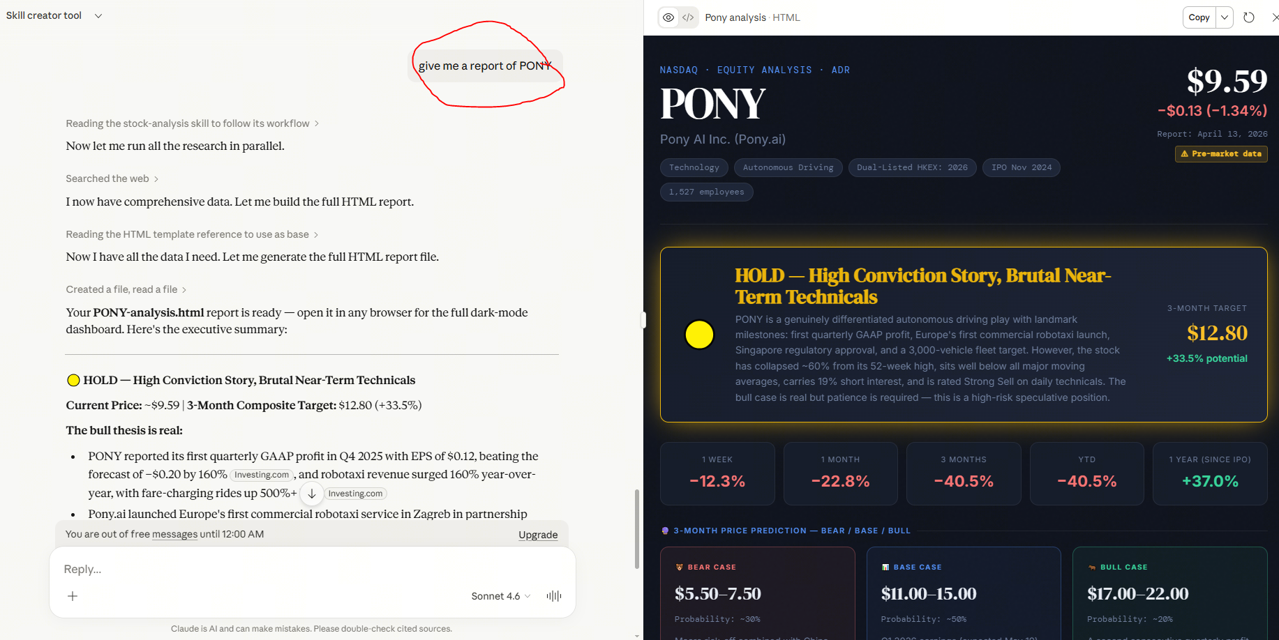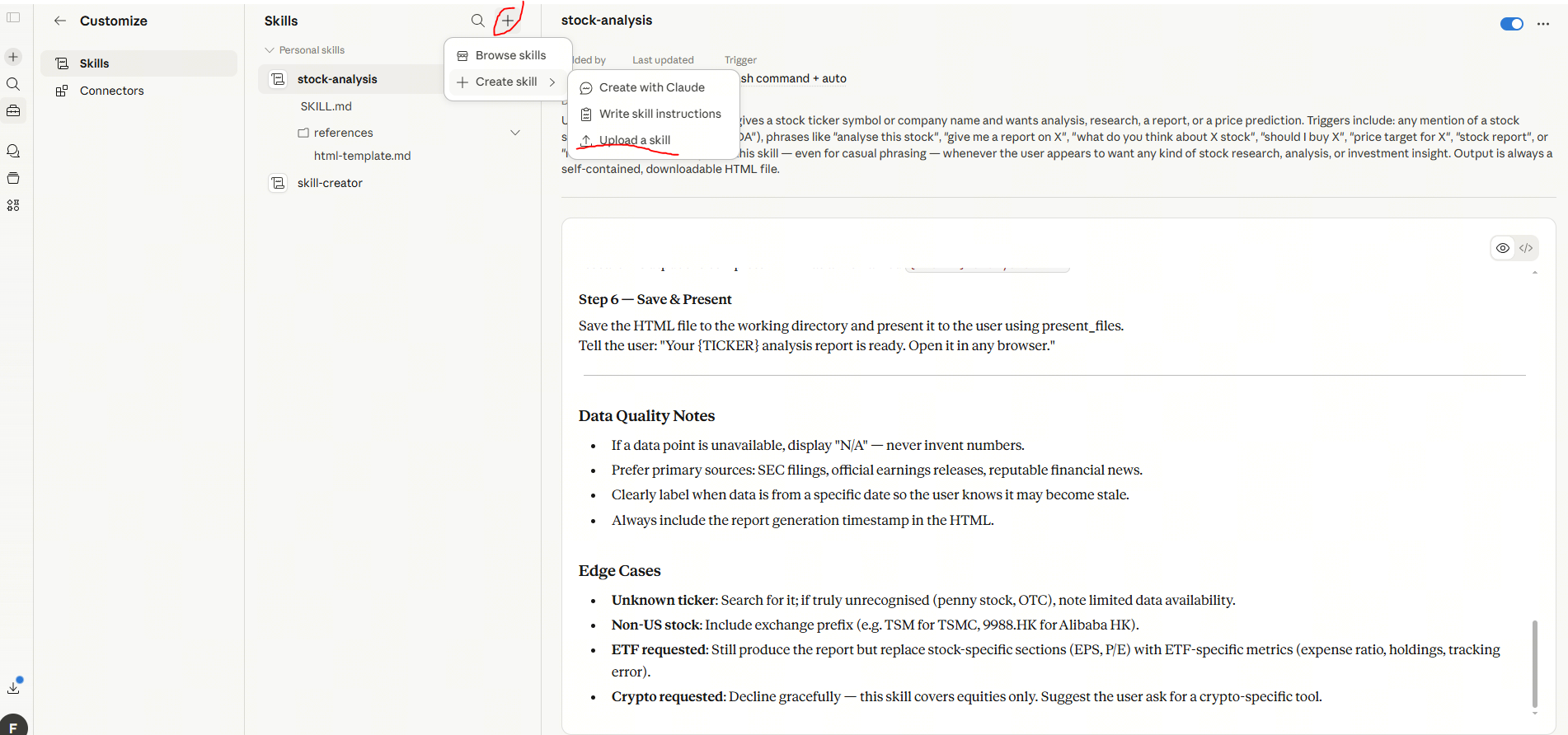 # 体验一下SKILLS的使用 * 以下skill也是我直接描述完我的需求之后claude code帮我生成的,其中README的描述非常详细的展示了针对股票价格分析的信息输入检索和整合,用于对未来三个月的指定股票价格进行分析给出HTML报告 [【附件】stock-analysis-skill.zip](/media/attachment/2026/04/stock-analysis-skill.zip) # 具体使用流程 ## 1. 下载上面的zip文件并登录claude code 地域限制,请科学上网不要选择中国地区防止被风控 https://claude.ai/chat ## 2. claude code中添加skill https://claude.ai/customize/skills 点击小按钮,选择"upload a skill"  ## 3. 测试一下skill * 根据skill的描述,可以按照指定话术给你一个股票的名字,例如 “give me a report of PONY”  * 可以看到claude code会直接使用定义的skill 执行流程得到结果  * 可以看到如下报告 [【附件】PONY-analysis.html](/media/attachment/2026/04/PONY-analysis.html)