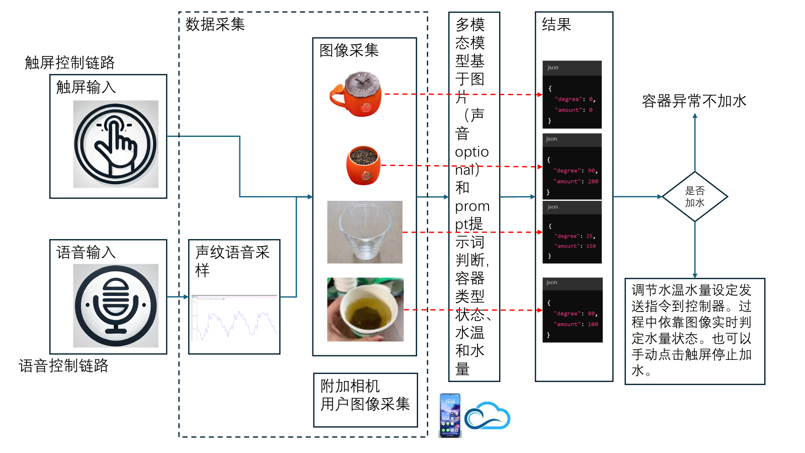 # 简介 * https://github.com/FengD/SmartSip  `SmartSip`是一款智能饮水机。之所以要做一款这样的饮水机主要是因为经过市场调研,市面上的饮水机无法满足我的一些综合性的需求,相关需求可能存在一些共性。所以希望这样一款饮水机能够给我的日常用水带来一些比较有意思的体验。`同时尽可能的简化操作过程,老少皆宜,并对健康管理给出详细建议也是一个重要的尝试`。 # 市场调研 如果搜索饮水机大概会见到这么几种品类: 1. 最简单的吸水式饮水机,一般会在水桶顶部安装一个装置,通过按压或者电动抽水的方式在较大的水桶中抽水到水杯或者水壶里。这种类型的装置在用水上比较方便,针对比较大的水桶避免了搬运和卫生问题。缺点是无法进行对水温的控制和加热;  2. 考虑到如果对水有加热的需求,基于上面第一种饮水机会衍生出两类产品。一类产品是仍然保持对抽水装置的设计,将水抽到一个可用于加热的水壶中,再进行加热;再有一类就是可以将水导入一个饮水机自带的制定容器在出水时进行即热调节。这两种产品都能解决对水使用且加热的需求,但是前者基本上无法实现对水温的精准控制,基本是加热到100°过程中需要手动停止,并且实际使用上想喝到较高温度的水,相对来说也会慢一些,优点是一般会有一个温度传感器,能够看到水温。而第二类虽然可以可以实现速热,但是手动上水的操作确实是个体力活,而且目前市面上能够看到的最大的容器大概1.6L,如果按照一杯水150-300ml计算得话,基本上一个人生活平均一天要上一次水。  3. 目前市面上看得到唯二的饮水器,能够兼顾1、2中的所有功能,但是不能实现对水温的精确控制;  所以,结合人工智能和传感器,同时满足以上需求的想法展现出来。 # 产品功能 1. 满足对于大水桶使用的抽水和卫生问题; 2. 满足即热的需求; 3. 针对于目前即热功能较粗的温度调节范围、挡位选择和水量调节,通过摄像头+麦克风+多模态大模型的组合实现对于接水的一键控制。整个组合可以做到对于下方容器的检测(包括类型,摆放位置以及是否存在遮挡覆盖物等),容器中物品的检测(粉状物如奶粉、速溶咖啡、抹茶粉,茶叶如红茶、绿茶、白茶、黑茶、果茶、花茶等),从而智能决定水温、水量,加水过程中对加水量进行自动检测,防止溢出。 4. 同时因为有语音的加持,还可以通过声音对饮水机进行控制,并且通过对声纹进行识别,进行个性化定制的需求; 5. 考虑到智能化识别本身需要一定算力,这个算力运行可以在手机上运行,也可以跟云上的服务进行交互,如果有手机加持,可以考虑添加使用手机上的相机或者额外添加一个相机对使用人进行检测,防止儿童老人因为使用不当或者水温过热,出现安全问题;同时摄像头也能同声纹一样对使用人的饮水习惯进行自定义需求。 * `亮点:整个产品只有一个触屏作为摄像头可视化和唯一的按键。点击屏幕即可流出满足用户需求的水温和水量的出水` * 同时可依赖于本身硬件的无线通讯能力,实现配件拓展,例如自动化茶台,实现多人饮茶的泡茶流程的自动化。 * `在大家关注健康管理和摄入分析的背景下,高频交互场景的数据分析可以有效分析生活习惯给出健康建议` # 产品外观设计 # 产品硬件组成 1. 加热器,水泵; V0.1  V0.5  V1.0  2. 带sensor的控制器;   3. Round display & toucher  4. mobile or device to run LLM # 软件设计&算法流程 * 交互流程  * 软件 https://github.com/FengD/SmartSip/blob/main/docs/README-backend.md * 算法 https://github.com/FengD/SmartSip/blob/main/docs/README-LLM-test-report.md # Demo使用展示 * https://www.youtube.com/watch?v=Y3Pf3E_fhKw * https://www.bilibili.com/video/BV1fv7WztEy4/?vd_source=c551ef751ac5907298e9c711d193f9cd